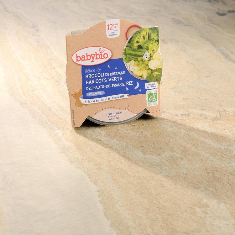 Votre bébé dès l'âge de 12 mois pourra, grâce à cette assiette, goûter aux brocolis accompagnés de haricots verts et de riz parfumé au persil.