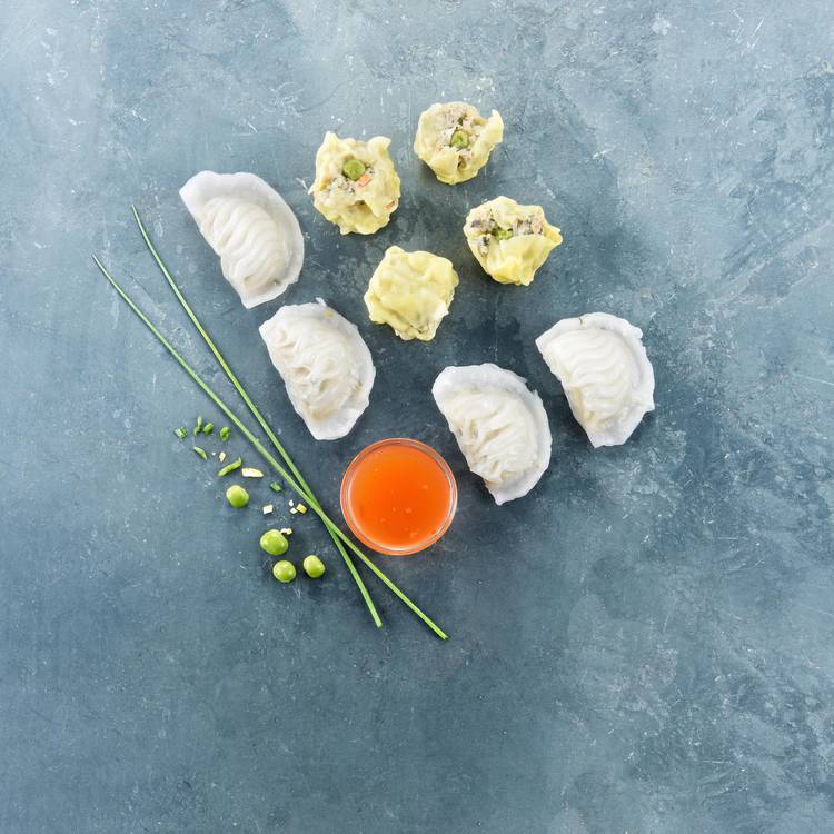Assortiment de bouchées asiatiques cuites à la vapeur : 4 Xiu maï porc et 4 Hacao au poulet - accompagnées de 2 sauces aigre douce.