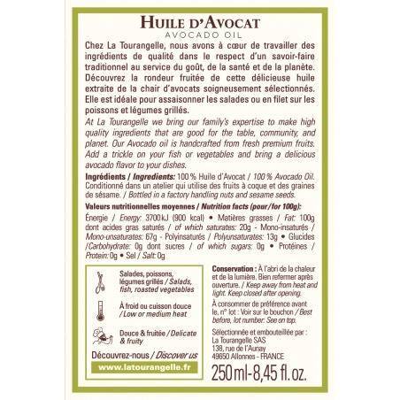 Origine : Cette huile est extraite directement de la chair d’avocats soigneusement sélectionnés, et non du noyau. Ce procédé préserve la richesse naturelle du fruit, notamment en vitamine E et en antioxydants. La marque La Tourangelle travaille l’extraction avec précision pour conserver une huile pure, stable et pleine de goût.