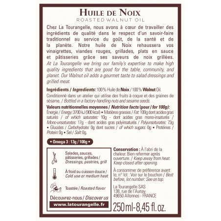 Origine : Issue d’un savoir-faire authentique plus que centenaire, cette huile est élaborée à partir de noix d’abord toastées pour révéler leurs arômes, puis pressées à l’aide d’une presse hydraulique traditionnelle. Ce procédé développe toute la richesse aromatique de la noix tout en conservant ses qualités nutritionnelles, notamment sa richesse naturelle en oméga 3.