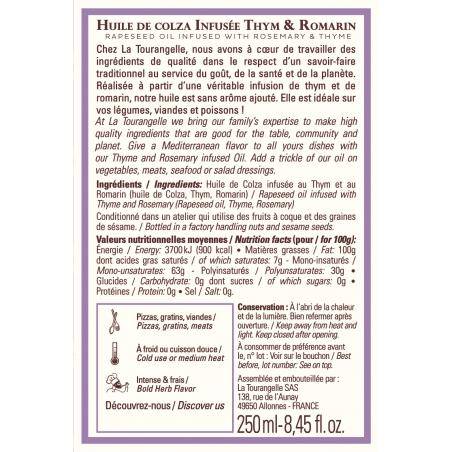 Origine : Cette huile est obtenue par infusion de véritables brins de thym et de romarin dans une base d’huile de colza neutre. Ce choix permet de restituer fidèlement les arômes des herbes sans les dénaturer. La recette est 100% naturelle, sans arômes artificiels, pour un goût authentique et franc.