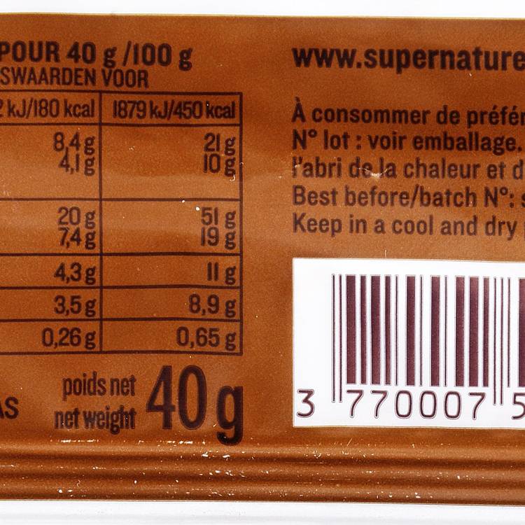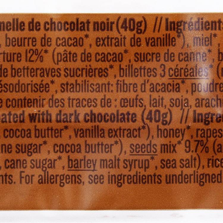 Saveur : Chocolat doux et enveloppant, jamais écœurant. Les graines apportent du relief, les flocons d’avoine structurent l’ensemble. Une texture généreuse mais légère, avec une sucrosité bien tenue à 7,4 g par barre.
