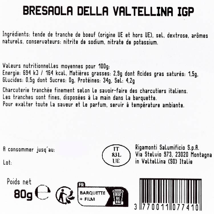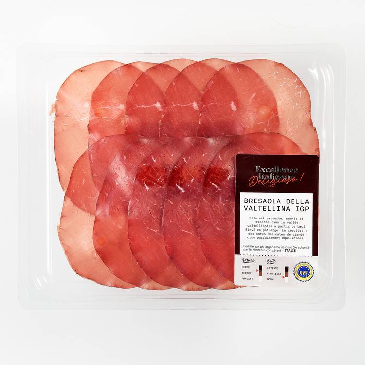 Origine & savoir-faire : Née dans la vallée de la Valteline en Lombardie, cette charcuterie de bœuf est salée, assaisonnée puis séchée et affinée à l’air frais des Alpes. Une viande maigre travaillée avec précision, qui gagne en tendreté et en finesse au fil de l’affinage. IGP oblige, le savoir-faire est encadré et respecté.