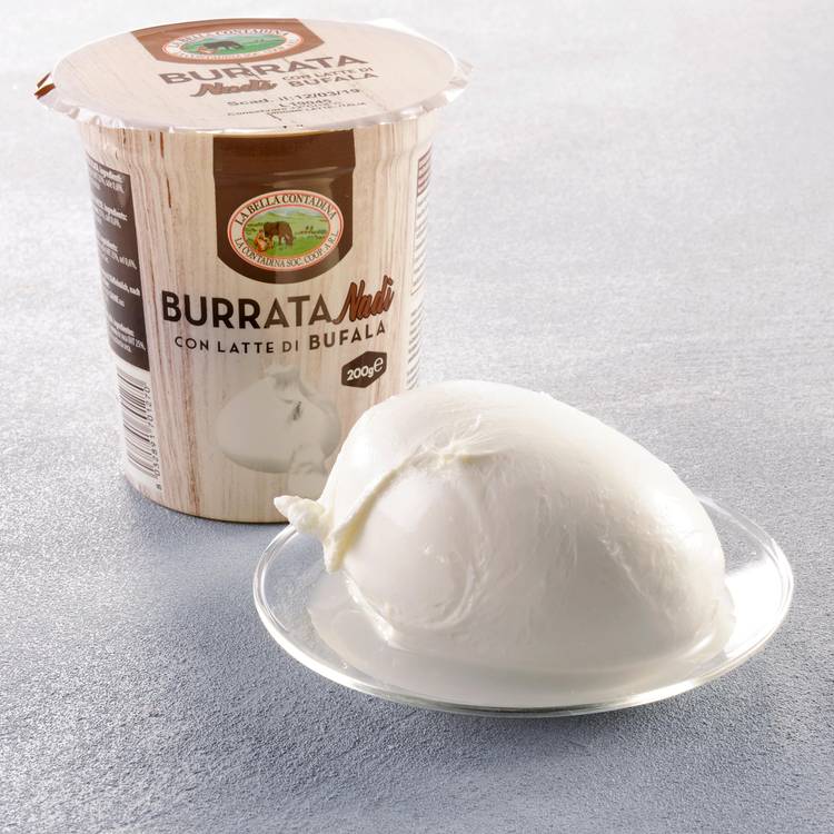 Fromage frais à base de lait de bufflonne qui se compose de pâte filée à l’extérieur, comme celle de la mozzarella, de stracciatella à l’intérieur, c’est-à-dire de petits morceaux de mozzarella stracciati déchirés, et de crème. Le nom de Burrata, qui fait penser au beurre (burro en italien), est donc trompeur.