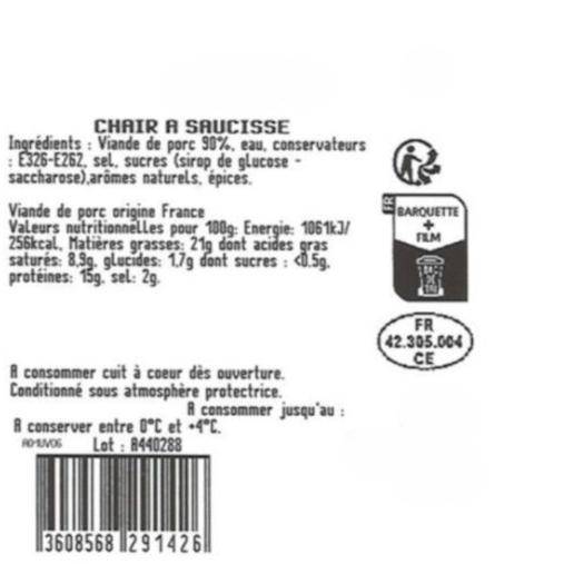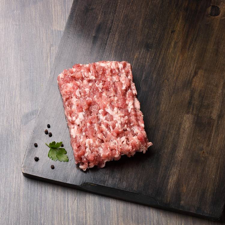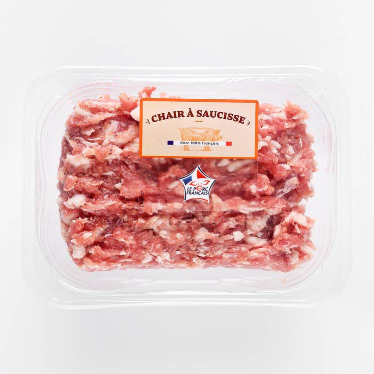 Race de viande : Porc issu de filières rigoureusement sélectionnées pour leur qualité et leur respect du bien-être animal. La viande est hachée finement et assaisonnée pour une texture fondante, prête à l'emploi.