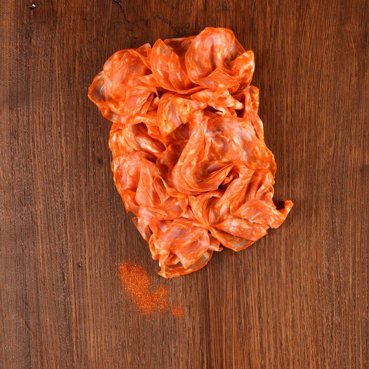Origine & savoir-faire : Inspirée de la tradition ibérique, cette chiffonnade est issue de porc d’origine Espagne. Chorizo sec, assaisonné puis affiné pour concentrer les arômes, avant une découpe fine qui libère instantanément le parfum du paprika.
