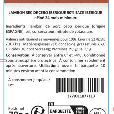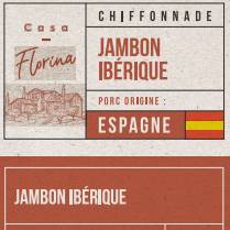 Origine & savoir-faire : Issu de la grande tradition charcutière espagnole, le jambon ibérique est salé puis longuement affiné pour développer ses arômes uniques. Tranché très finement en chiffonnade, il révèle toute la finesse de sa texture et de son gras délicatement persillé.