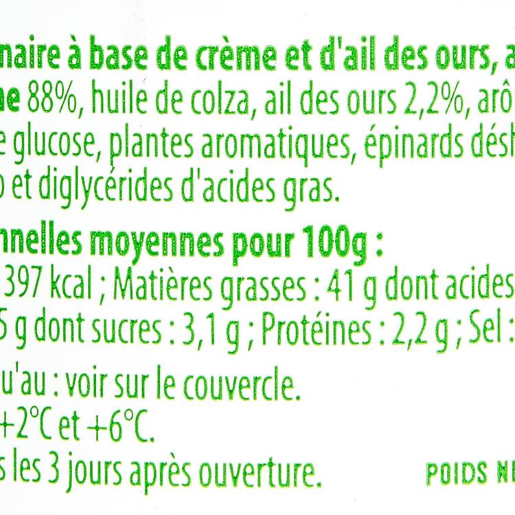 Une crème à l’ail des ours qui sent bon le printemps, même en plein octobre. Texture nappante, goût herbacé, touche aillée tout en finesse. Elle coche toutes les cases d’un bon basique à twist.La base est sérieuse : crème fraîche épaisse, 40 % de matière grasse, origine France, et une marinade à l’ail des ours qui fait toute la différence. L’ail des ours, c’est la version sauvage de l’ail classique. Plus doux, plus vert, plus subtil.