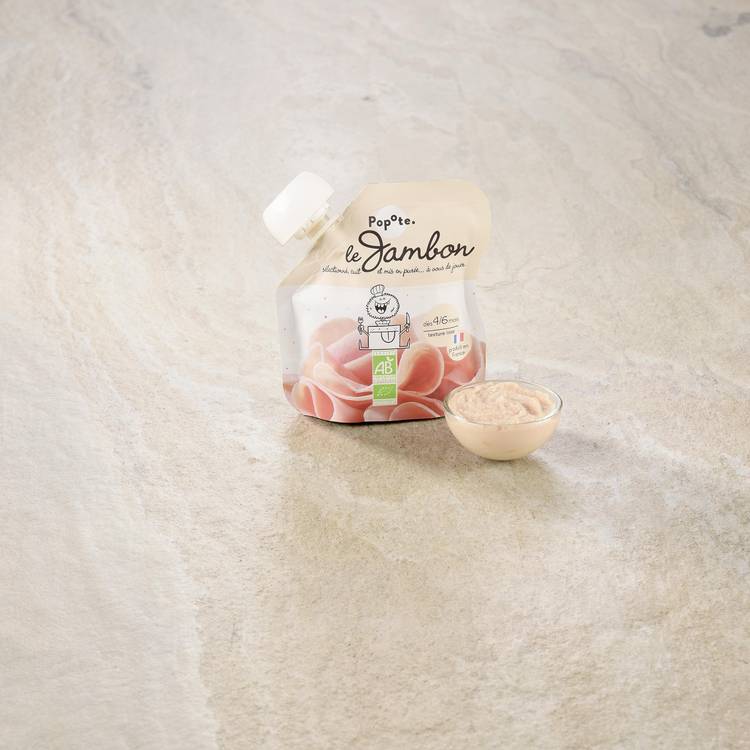 Origine : Recette Popote à base de jambon bio 51 %, pomme de terre bio 29 % et eau de cuisson 20 %. Des ingrédients issus de l’agriculture biologique, simplement cuits puis mixés. Aucun ajout inutile, pour respecter le goût réel des aliments.