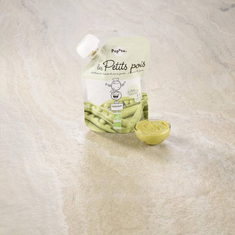 Origine : Recette de la marque Popote à base de petits pois bio 65 % et d’eau de cuisson 35 %. Des ingrédients simplement cuits puis mixés, sans sucre ajouté, sans conservateurs ni additifs. Une composition courte, idéale pour la diversification alimentaire.
