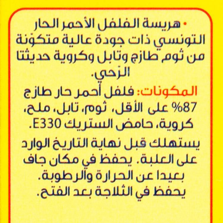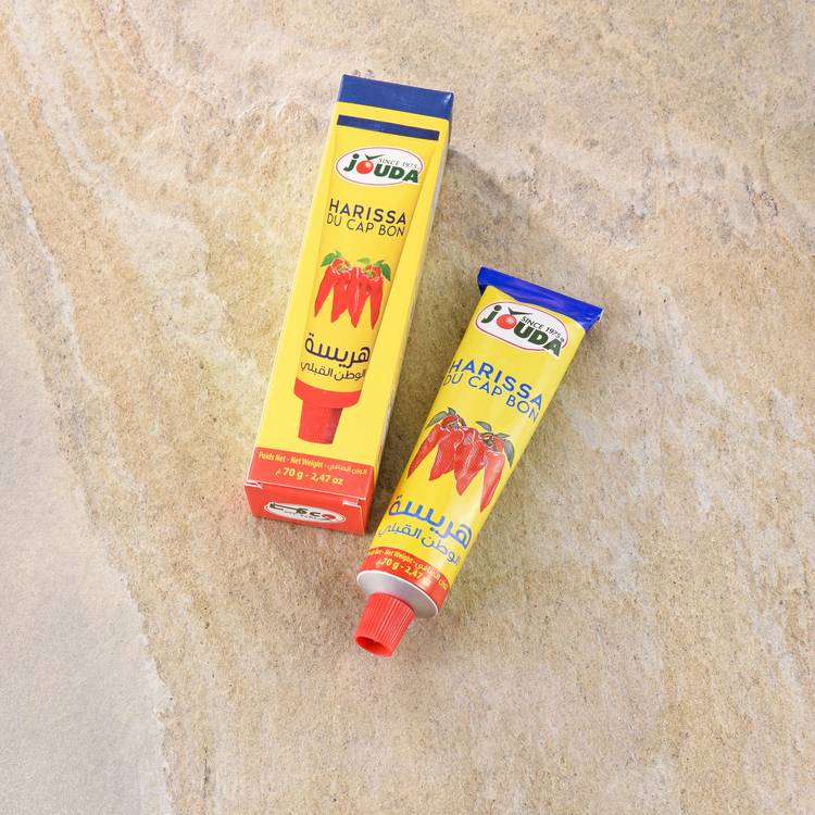 Harissa emblématique de Tunisie, préparée à partir de piments rouges soigneusement sélectionnés, broyés et assaisonnés selon la tradition. Une recette emblématique du Cap Bon, région réputée pour ses piments au goût intense.