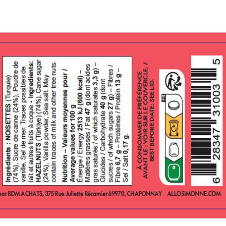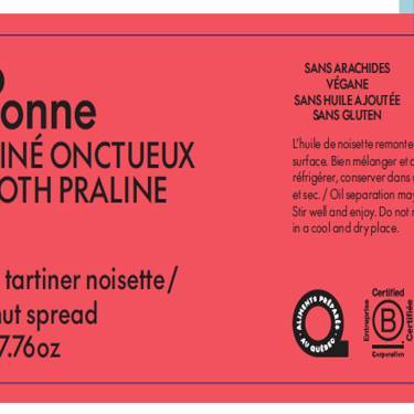 Le praliné noisette onctueux joue la carte de la douceur absolue. Texture lisse, presque soyeuse, il s’étale sans résistance et fond vite en bouche. Avec 74 % de noisettes, le goût est net, délicatement torréfié, soutenu par des notes de caramel bien dosées. Le sucre reste discret, la noisette mène la danse. Un équilibre simple, efficace, qui va droit au plaisir.