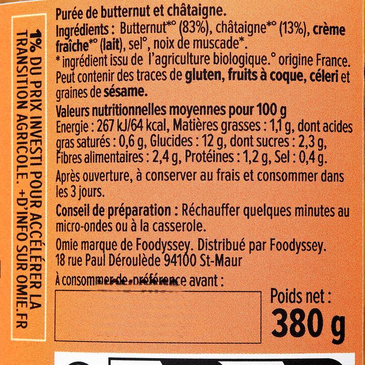 Les butternuts sont cultivés et cuisinés en Charente avec notre conserverie partenaire, engagée dans une démarche de transition agricole. Les châtaignes du Sud-Ouest apportent une note subtilement sucrée.