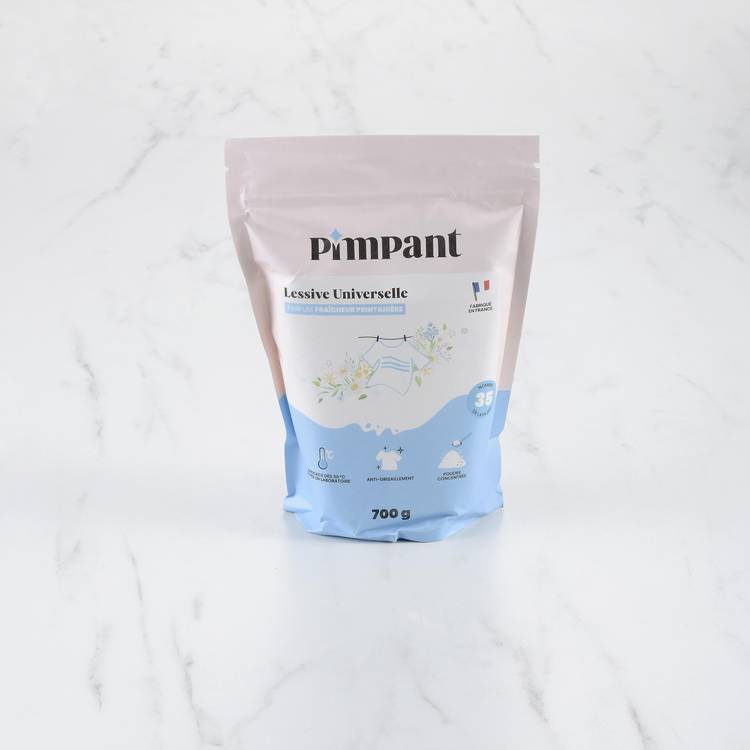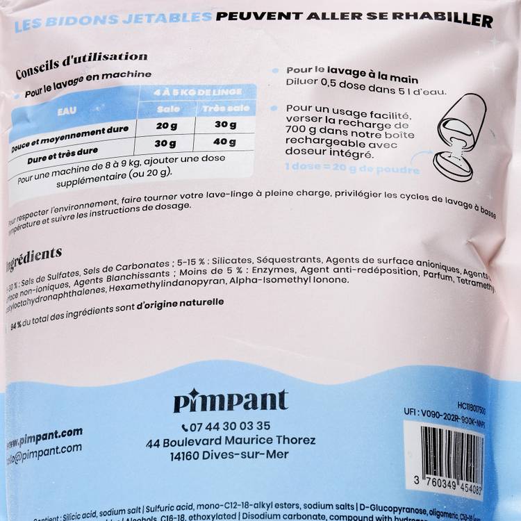 Versez la recharge dans votre boîte Pimpant avec son couvercle doseur. Pour une machine de 4 à 5 kg en eau douce, comptez 1 dose (20 g). Ajoutez-en une seconde si l’eau est dure ou si le linge est bien chargé. Versez la poudre dans le bac à lessive ou directement dans le tambour. Lancez votre machine à 30°C et laissez la magie opérer. Pour un lavage à la main, diluez une demi-dose dans 5 litres d’eau tiède.