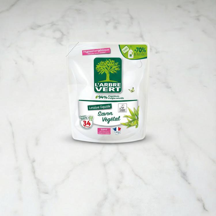 Du linge frais, une formule clean, et un geste pour la planète. La recharge de lessive au savon végétal L’Arbre Vert coche toutes les cases du quotidien responsable. Hypoallergénique, testée dermatologiquement, elle respecte toutes les peaux, même les plus sensibles. Sa formule concentrée nettoie efficacement, tout en déposant un parfum frais et discret sur votre linge, sans jamais l’étouffer. Blancs, couleurs, vêtements du quotidien ou textiles plus délicats : elle s’adapte à tout, sans fausse note.