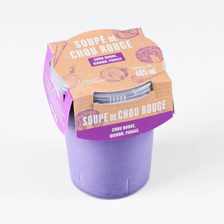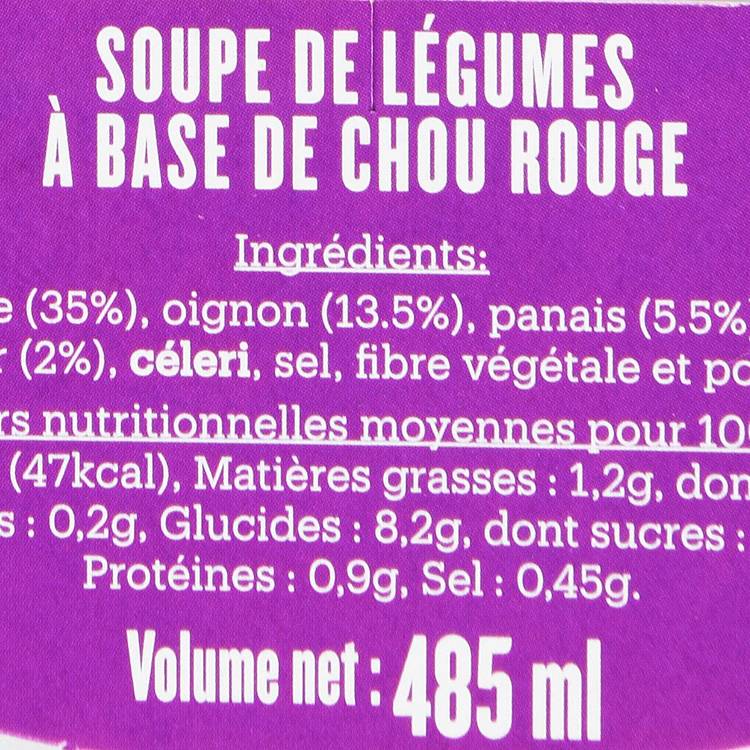 À la cuisson, le chou rouge libère sa saveur douce et légèrement sucrée, qui se mêle aux légumes de base pour une soupe équilibrée. La texture est veloutée, la couleur intense, presque surprenante dans l’assiette. Chaque cuillerée apporte chaleur et rondeur, sans lourdeur.