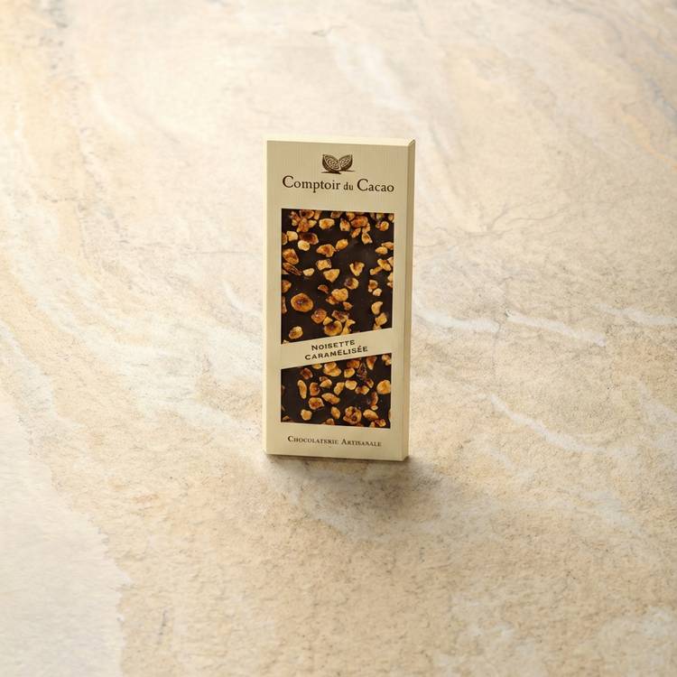 Origine : Cette tablette Comptoir du Cacao est élaborée à partir de cacao 70 % issu majoritairement de fèves Forastero d’Afrique de l’Ouest. Les noisettes caramélisées, intégrées généreusement, apportent une dimension gourmande à ce profil intense. La marque s’inscrit dans une démarche responsable via la fondation Cocoa Horizon.