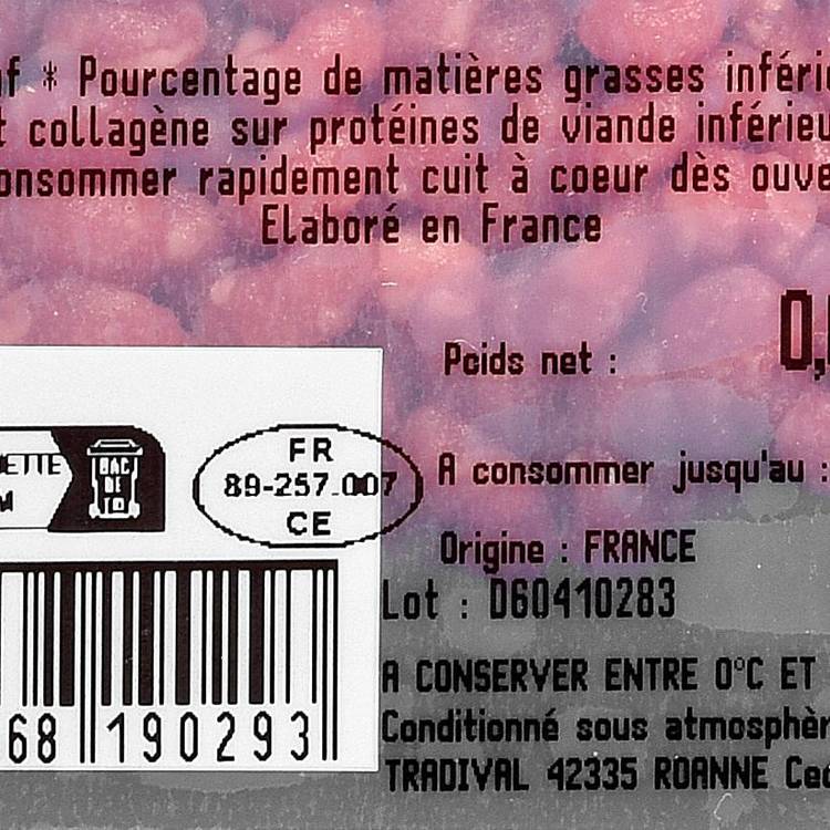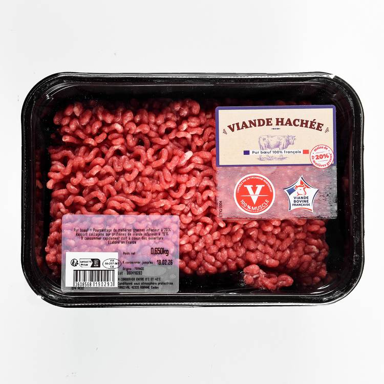 Race de viande : Issue de bœuf rigoureusement sélectionné, cette viande hachée privilégie l’équilibre entre maigre et gras pour garantir saveur et tenue à la cuisson. Haché frais, le bœuf conserve sa belle couleur rouge et son grain régulier, signature d’une viande travaillée dans les règles de l’art.