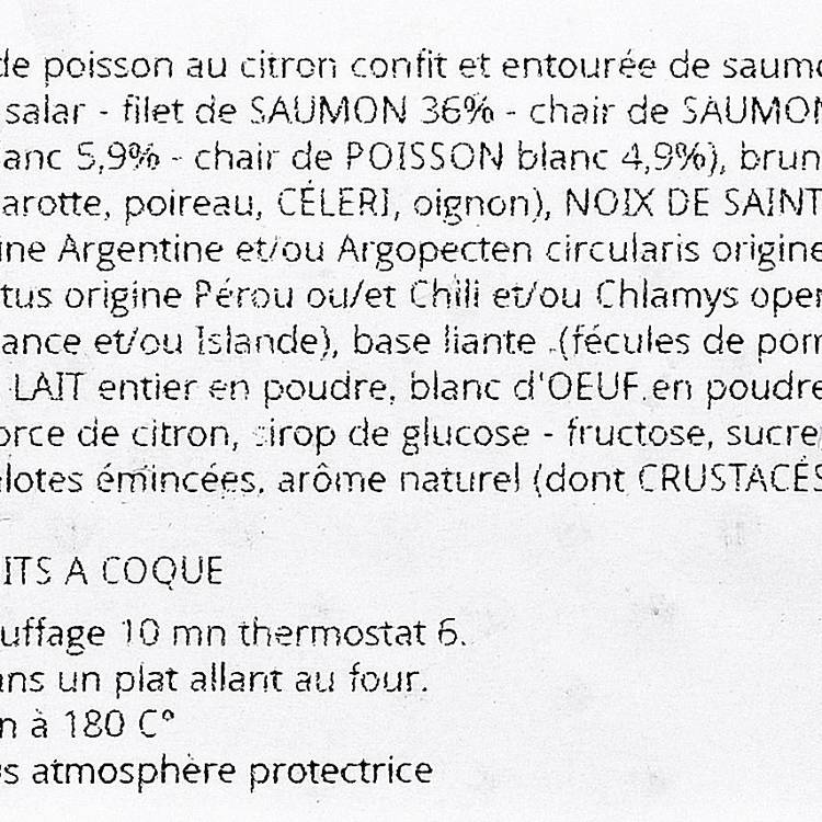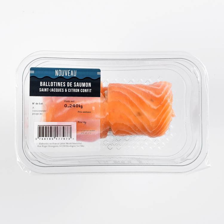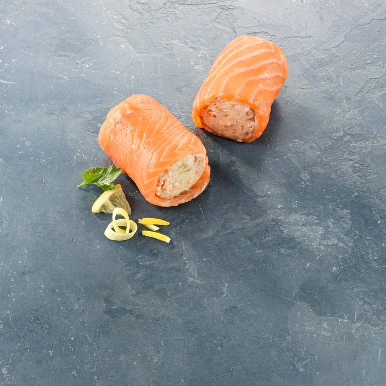 Type de poisson : Préparation à base de saumon d’élevage (poisson gras et rose), farcie d’un mélange cuit de poisson et de noix de Saint-Jacques, le tout relevé au citron confit.
