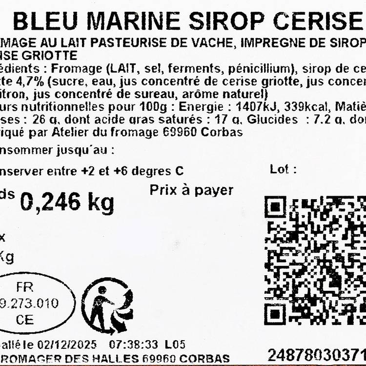 Bleu mariné, selon une méthode artisanale où le sirop de cerise griotte est infiltré directement dans la pâte du fromage par macération, créant un profil aromatique inédit.