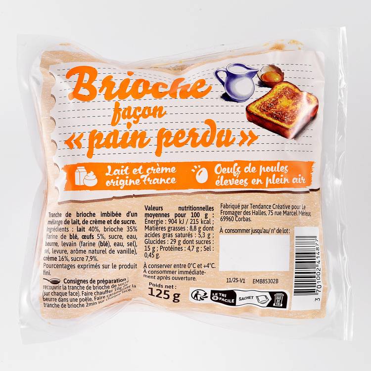 Origine : Inspirée des desserts de bistrot parisiens, cette brioche revisite le pain perdu version crème. Imbibée d’un mélange de lait, de crème et de sucre, elle gagne en richesse et en onctuosité par rapport à une brioche classique simplement toastée.