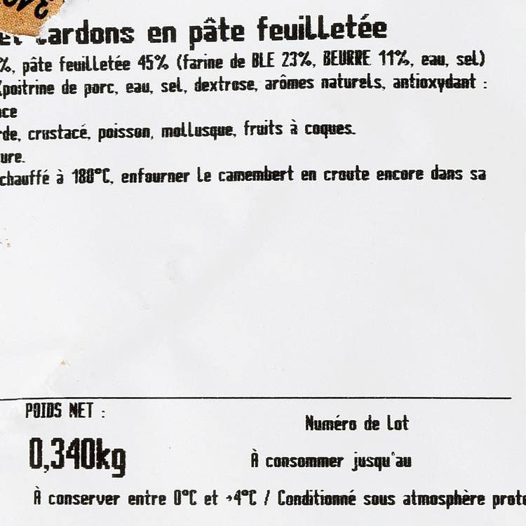 Produit généreux, effet waouh garanti. Le camembert en pâte feuilletée coche toutes les cases : croustillant à l’extérieur, coulant à cœur. Une entrée rustique, facile à enfourner, qui envoie du lourd sans en faire des caisses. À sortir du four juste doré, à partager directement à table, à la bonne franquette.Un cœur coulant de camembert, des lardons bien dorés, le tout enveloppé dans une pâte feuilletée qui croustille à chaque bouchée. Ce petit feuilleté coche toutes les cases : fondant, fumé, doré. Il se tient à table, mais se dévore comme un plaisir coupable.