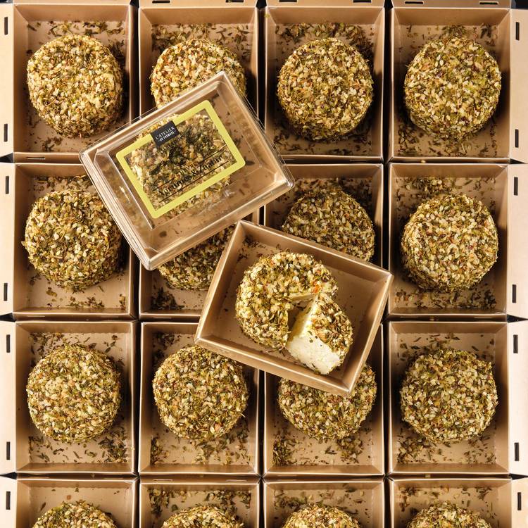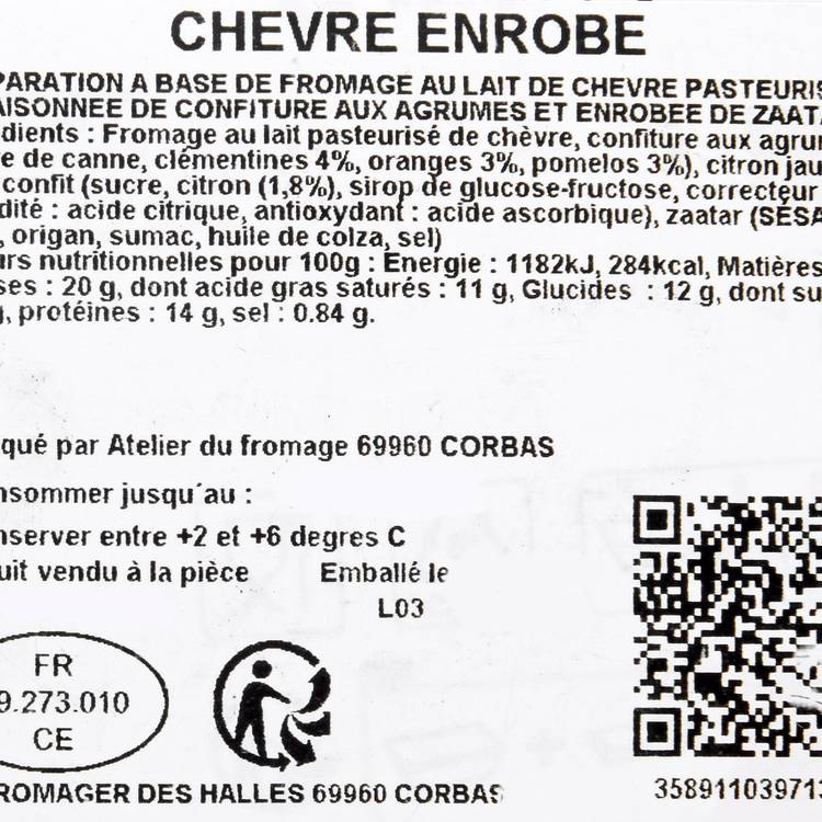Appellation : Ce fromage n’a pas d’appellation d’origine protégée, mais se démarque par son assaisonnement aux agrumes et son enrobage de zaatar, une association rare qui sublime la base lactée de la chèvre.