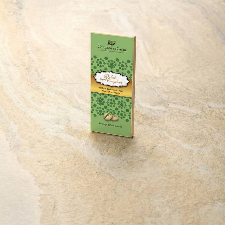 Origine : Cette tablette Comptoir du Cacao s’inspire des saveurs de Dubaï, avec un fourrage généreux composé à 50 % de pistache. Un savoir-faire artisanal qui marie gourmandise et intensité.