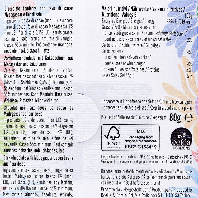 La maison Boella & Sorrisi signe ici une tablette taillée pour les palais curieux. Le sel vient claquer en fin de bouche, juste ce qu’il faut pour réveiller les papilles sans voler la vedette. Texture dense, fondante, presque veloutée. C’est le genre de tablette qu’on casse à la main, qu’on partage ou qu’on cache bien au fond du placard.