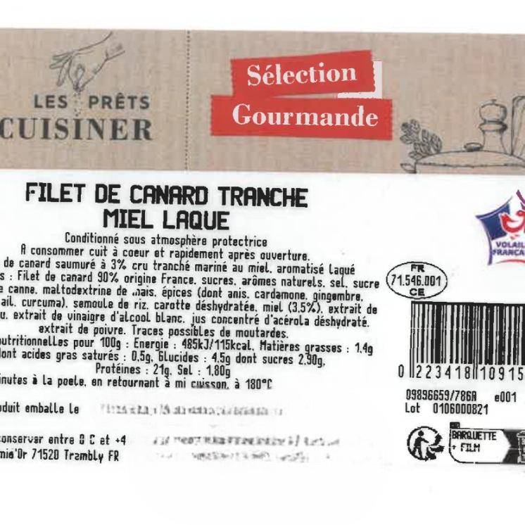 Race de viande : Canard 90 % origine France, élevé pour offrir une chair savoureuse, légèrement persillée. Tranché finement puis laqué, ce filet combine moelleux et générosité.