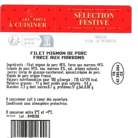 Saveur : Texture moelleuse, fondante à cœur grâce à la farce aux marrons. Un bel équilibre entre la douceur légèrement sucrée des marrons et la finesse du filet mignon.