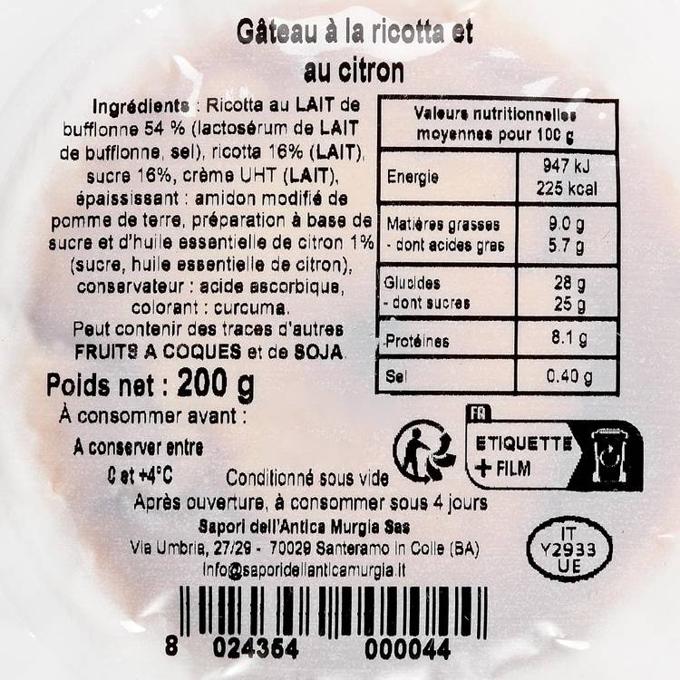 Origine : Spécialité des Pouilles, signée Sapori dell’Antica Murgia. Une ricotta riche (dont bufflonne) associée à une crème de citron qui apporte plus de fraîcheur que les versions classiques.