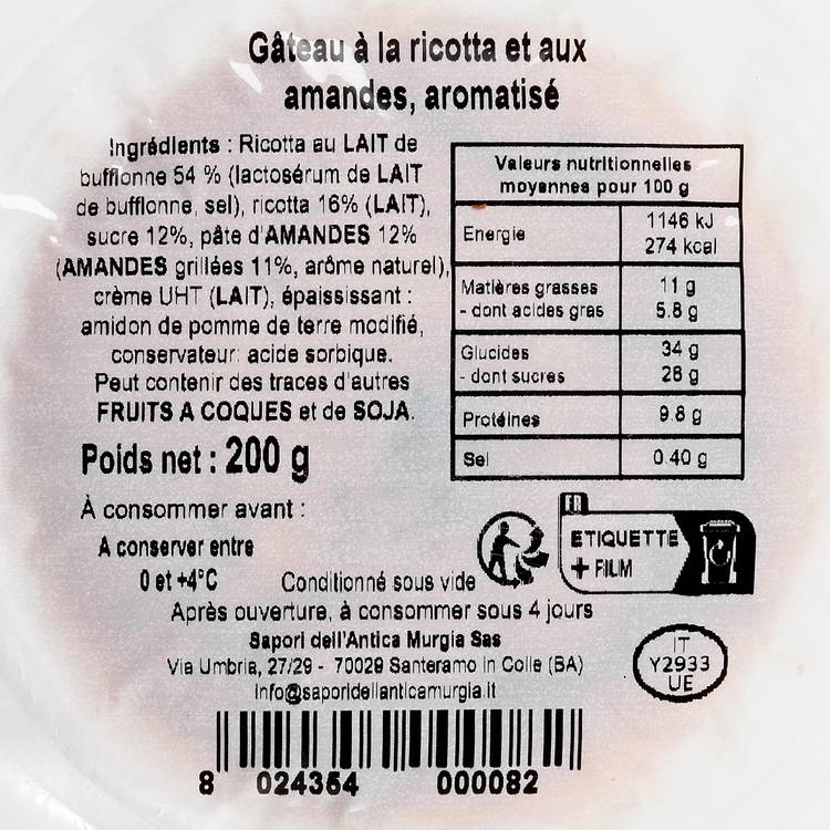 Origine : Spécialité des Pouilles, signée Sapori dell’Antica Murgia. La ricotta (dont une part de bufflonne) et les amandes apportent une richesse authentique, loin des gâteaux plus secs ou trop sucrés.