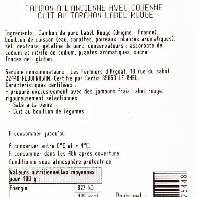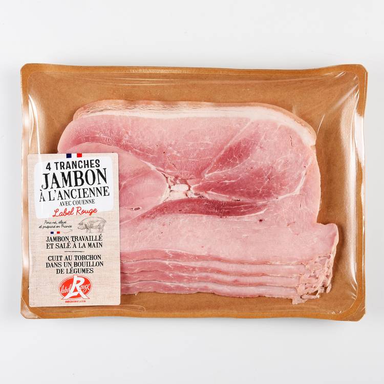 Saveur : Franc, rustique et généreux, ce jambon avec sa couenne révèle une chair fondante, doucement salée, avec un parfum légèrement fumé qui reste en bouche. Un vrai morceau de tradition à savourer tranché fin ou un peu plus épais.