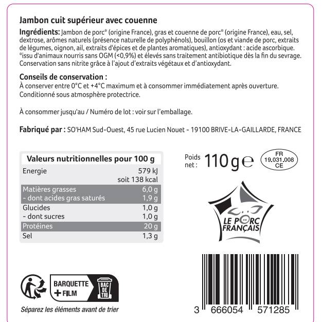 Jambon issu de porcs nés-élevés et transformés en France, traités sans antibiotique dès la naissance.