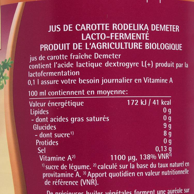 Le jus de carotte Rodelika, c’est l’antithèse du banal. Une carotte ancienne, rustique et pleine de caractère, ici lacto-fermentée pour révéler tout son potentiel. La fermentation ? Pas un gadget. Elle sublime la carotte, la rend plus douce, plus complexe, presque onctueuse en bouche. Son petit goût acidulé vient réveiller les papilles sans jamais les brusquer.