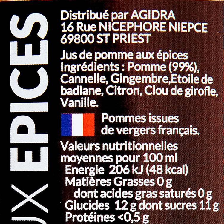 Optez pour le jus de pomme aux épices et laissez-vous emporter par son intense parfum d'épices et de fruits. Composé à 99% de jus de pommes issues de vergers français, ce délice combine à merveille la cannelle, le gingembre, l'étoile de badiane, le citron, le clou de girofle et une touche de vanille.
