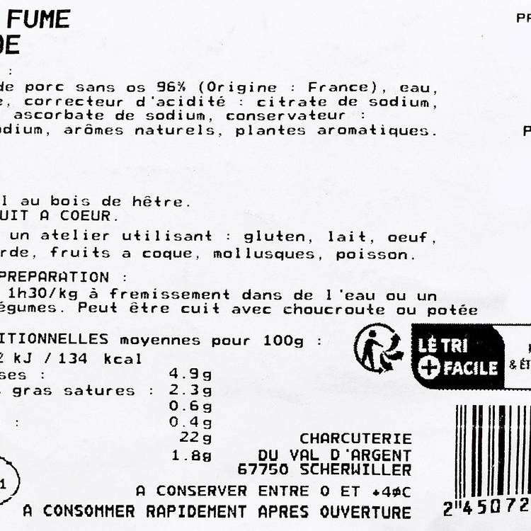 Race de viande : C’est une viande de porc sélectionnée pour sa régularité et sa tendreté, légèrement salée puis fumée au bois de hêtre. Une tradition allemande qui a traversé le Rhin avec panache.