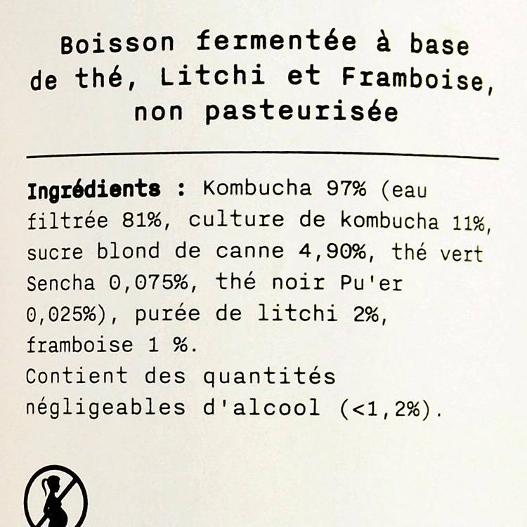 Saveur : Une base légèrement acidulée et fermentée, typique du kombucha, adoucie par le litchi et relevée par la framboise. L’ensemble est frais, subtil, avec une effervescence naturelle et une belle légèreté en bouche.