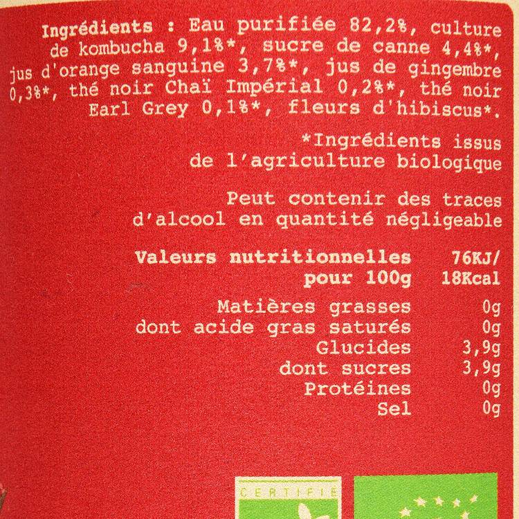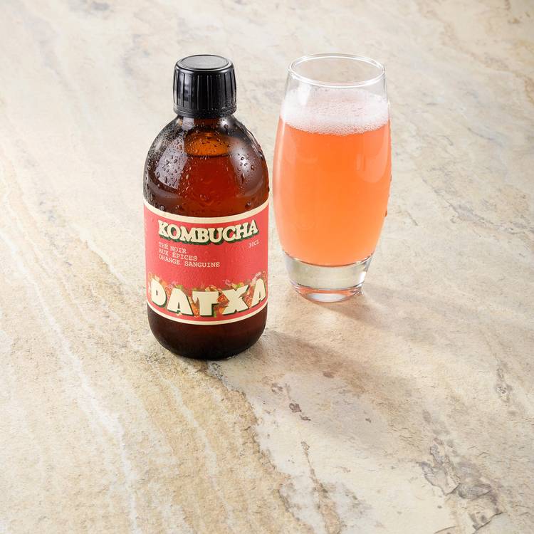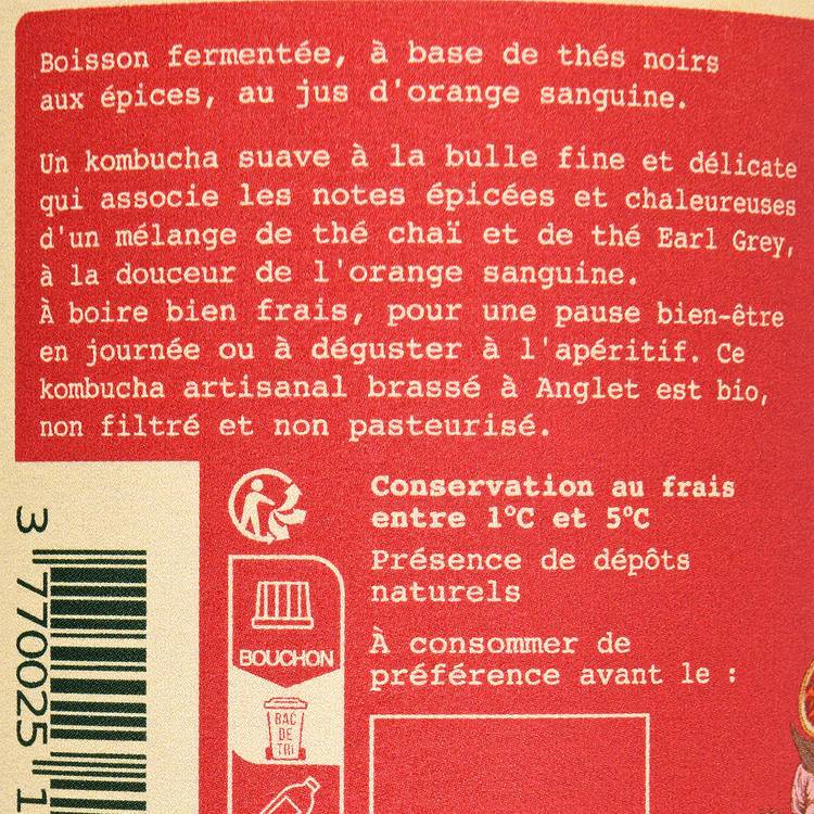 Un kombucha qui sort du lot, avec du fond et du caractère. À la base, un thé noir bien infusé, corsé juste ce qu’il faut. On y ajoute un mélange d’épices chaï – cannelle, cardamome, clou de girofle – pour une touche chaleureuse, presque réconfortante. Puis arrive l’orange sanguine : juteuse, acidulée, elle rafraîchit l’ensemble et donne ce petit twist fruité qui réveille les papilles.
