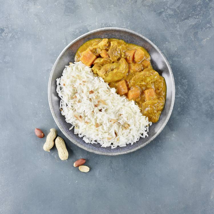 Saveurs & équilibre : Le poulet mijote dans une sauce à l’arachide onctueuse, typique du mafé malien et ouest africain. La pâte d’arachide apporte une profondeur gourmande, légèrement toastée, équilibrée par des notes salées et subtilement épicées. Un plat ample, réconfortant, sans lourdeur.