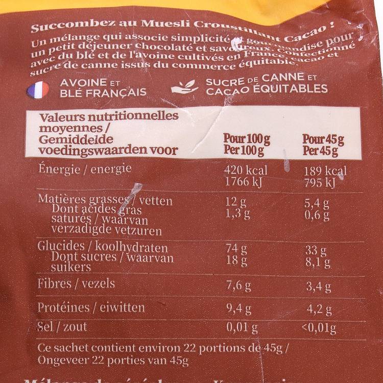 Ce muesli croustillant joue la carte du plaisir sans détour. Avoine, blé, riz : trois céréales bien choisies, toastées juste ce qu’il faut pour offrir une texture craquante à chaque bouchée. Le cacao vient napper le tout avec subtilité, entre rondeur et intensité. On est sur une recette simple, bien ficelée, pensée pour les matins qui démarrent vite, mais bien.
