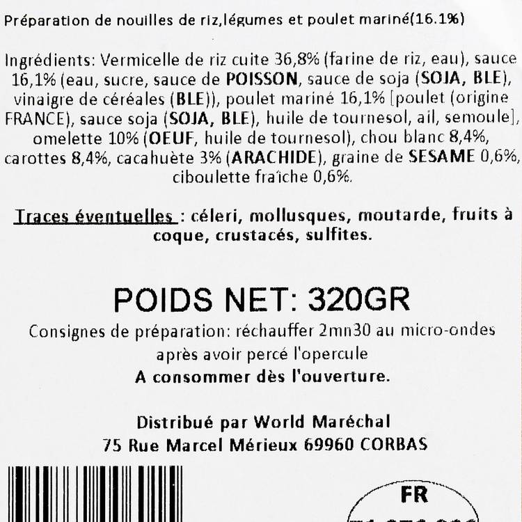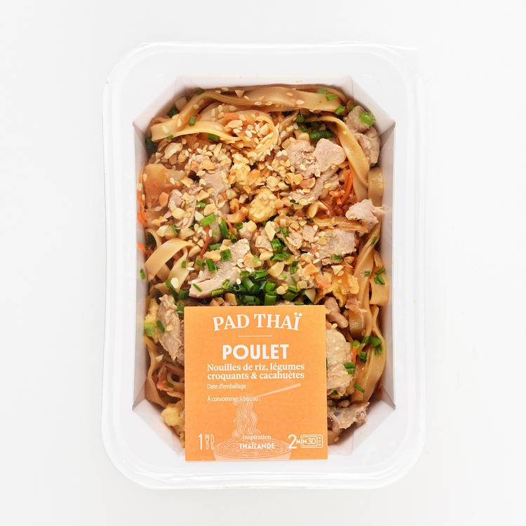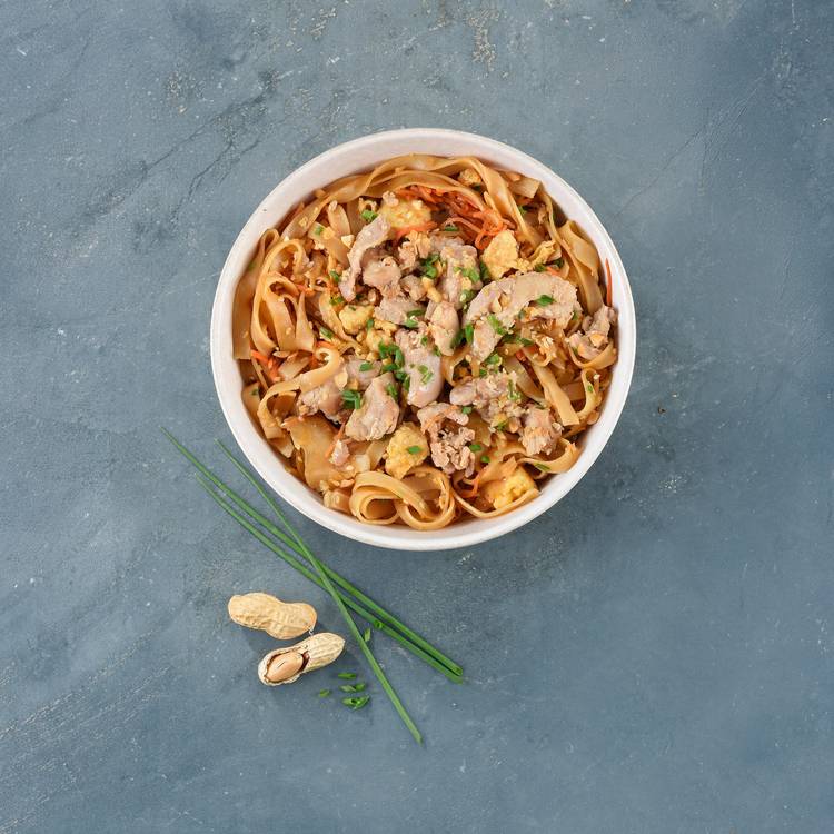 Saveurs & équilibre : Une base de nouilles de riz nappées d’une sauce légèrement sucrée-salée, relevée juste ce qu’il faut. Le poulet apporte de la rondeur, les légumes croquants équilibrent, et les cacahuètes viennent signer le tout avec une touche grillée.