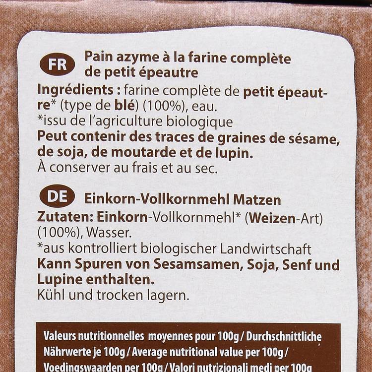Un pain azyme façonné uniquement à partir de farine complète de petit épeautre bio et d’eau — zéro levure, zéro sel ajouté, zéro sucre. Résultat : des galettes fines, très croustillantes, au goût légèrement toasté, doux et rustique à la fois.