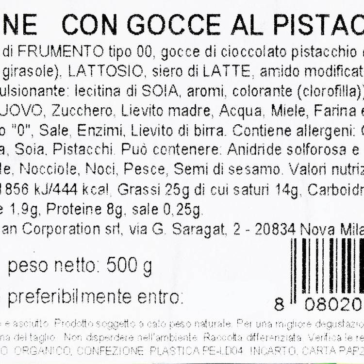 Un panettone qui sort du rang. Ici, pas de raisins ni de fruits confits. À la place, des éclats fondants de chocolat à la pistache, couleur vert tendre, discrets mais bien présents. L’amertume élégante du fruit sec vient twister la douceur de la pâte, riche en beurre et en jaunes d’œufs. Moelleux à cœur, parfumé juste ce qu’il faut, c’est le genre de version qui fait hésiter les puristes… et fondre les autres.