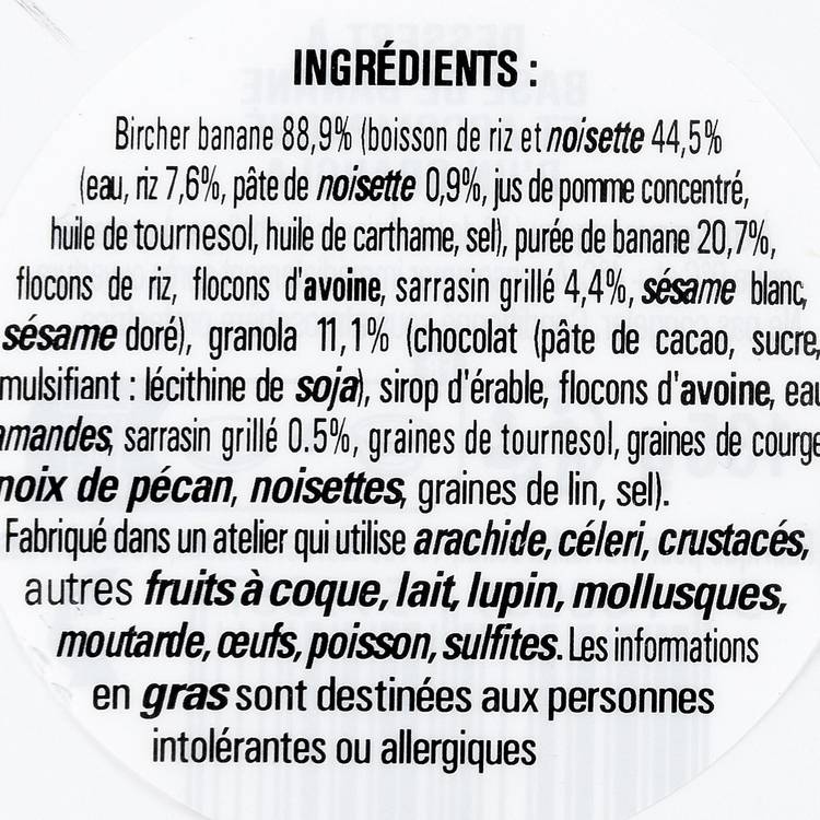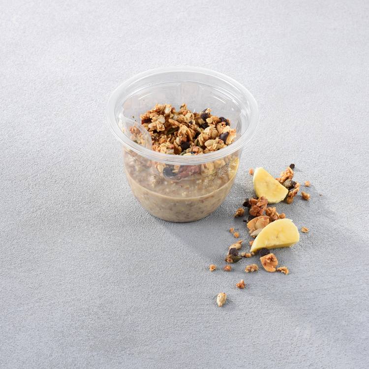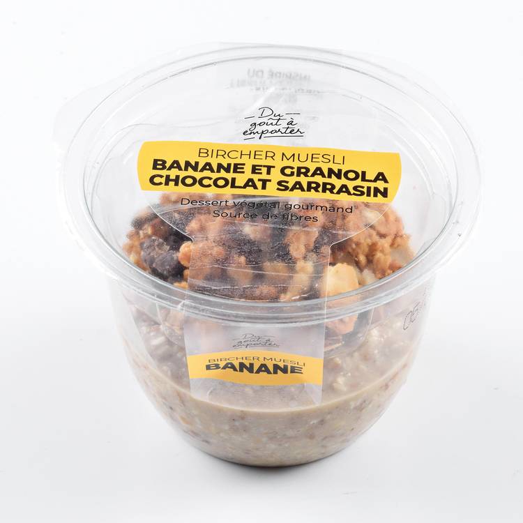 Les flocons de sarrasin gonflent lentement pendant la nuit, jusqu’à obtenir une texture fondante, presque crémeuse. La banane apporte sa rondeur sucrée et naturelle, qui se marie au chocolat sans lourdeur. Par-dessus, un granola croustillant ajoute le contraste qu’il faut : un jeu de textures qui évite la monotonie. Frais, équilibré, avec cette note cacaotée qui ramène toujours à l’enfance.