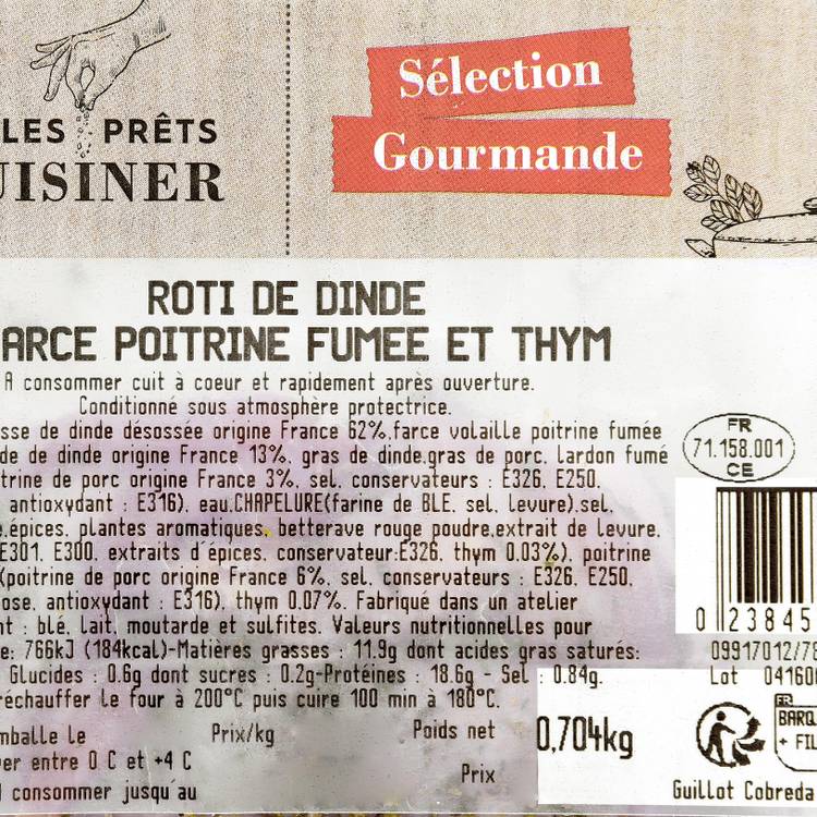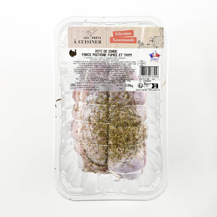 Race de viande : Dinde française, sélectionnée pour sa chair maigre mais moelleuse à la cuisson. La farce associe poitrine fumée, mie de pain et aromates, pour une texture fondante et une tenue parfaite à la cuisson.