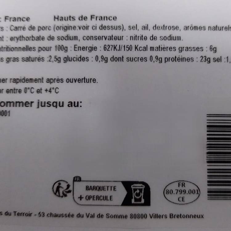 Origine & savoir-faire : Élaboré à partir de carré de porc origine France, ce rôti est salé puis cuit lentement pour conserver le moelleux de la viande et fixer les arômes. Une charcuterie cuite, simple et efficace, travaillée dans la tradition des salaisons des Hauts-de-France.