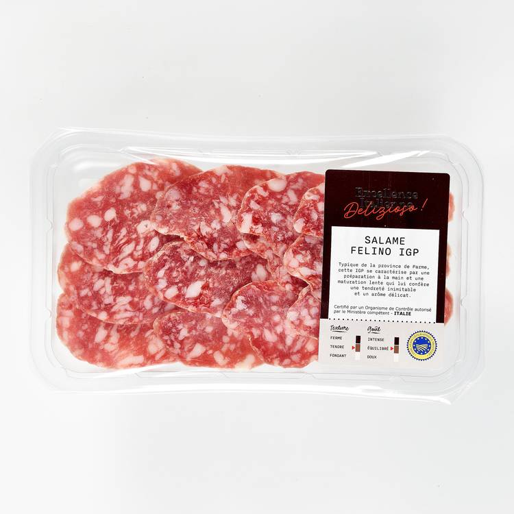Origine & savoir-faire : Originaire de la province de Parme, ce saucisson IGP est préparé à la main à partir de viande de porc finement sélectionnée. Hachage précis, assaisonnement juste, puis maturation lente : un affinage qui développe sa tendreté signature et ses arômes délicats.