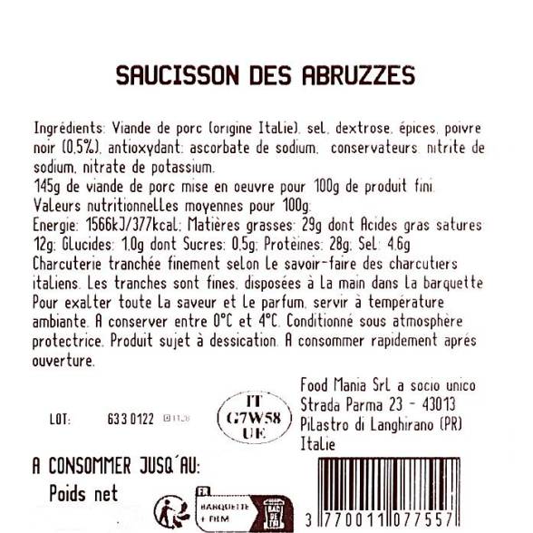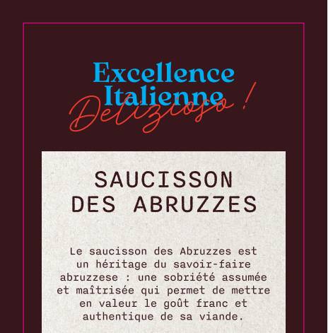 Une anecdote ou un détail qui fait la différence : Dans les Abruzzes, ce type de saucisson était souvent préparé en hiver, puis suspendu dans des pièces fraîches pour un affinage naturel. Une tradition paysanne devenue signature de goût.